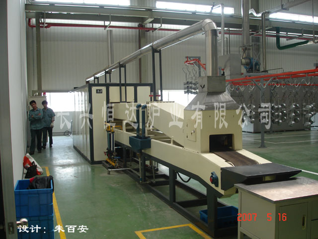 該設備由傳動機構(進料段)、預熱段、加熱爐體、冷卻段、從動機構(出料段)、水路氣路控制系統、電氣控制系統及液氨分解爐等組成。